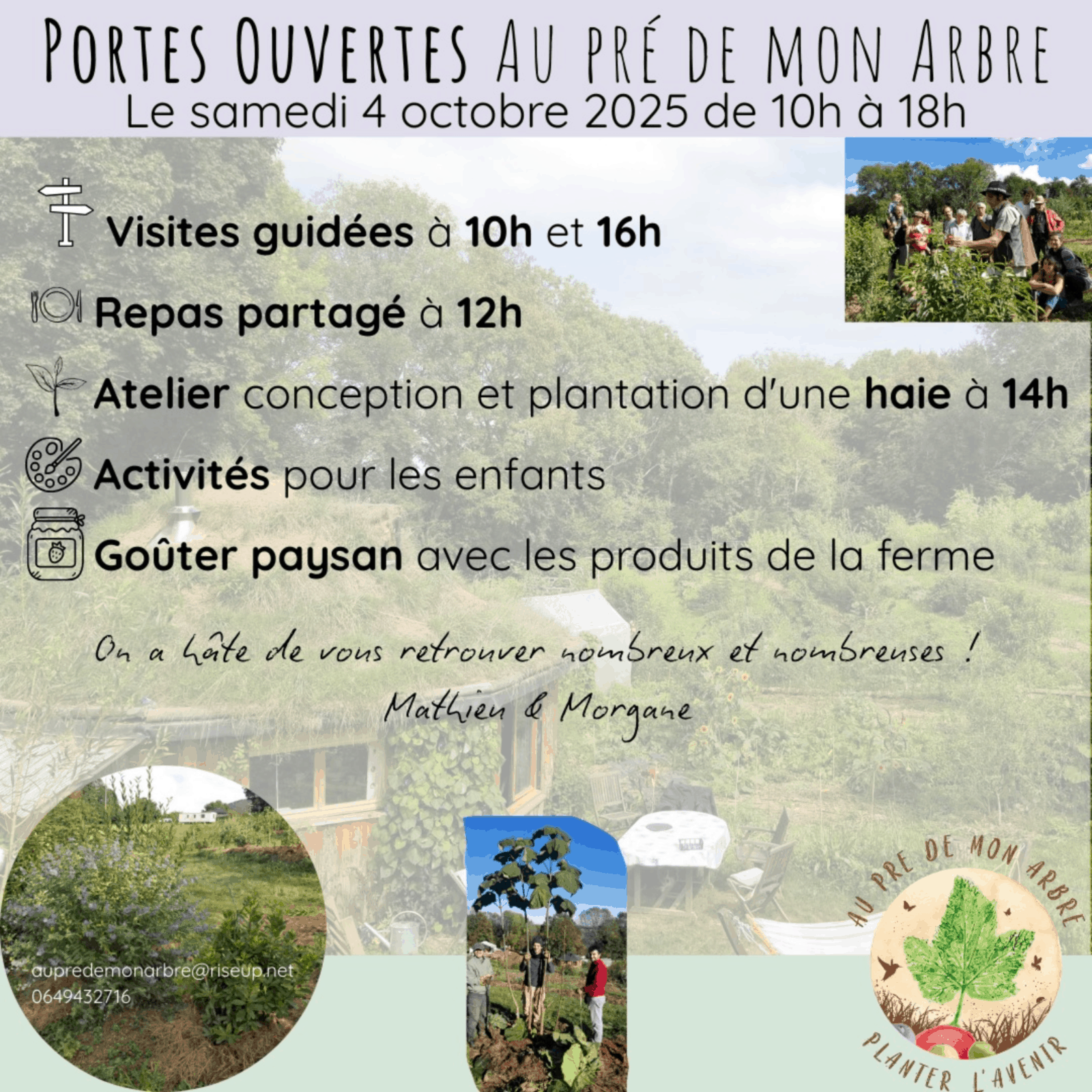 Bienvenu aux portes ouvertes de la pépinière et du jardin forêt, avec plus de 250 variétés d'arbres et d'arbustes, 2 visites guidées à 10h et 16h, repas partagé à 12h, atelier conception et plantation d'une haie à 14h, activités pour les enfants (impressions végétales, vannerie sauvage, land art) goûter avec les produits de la ferme (confitures, coulis, tartes aux fruits).