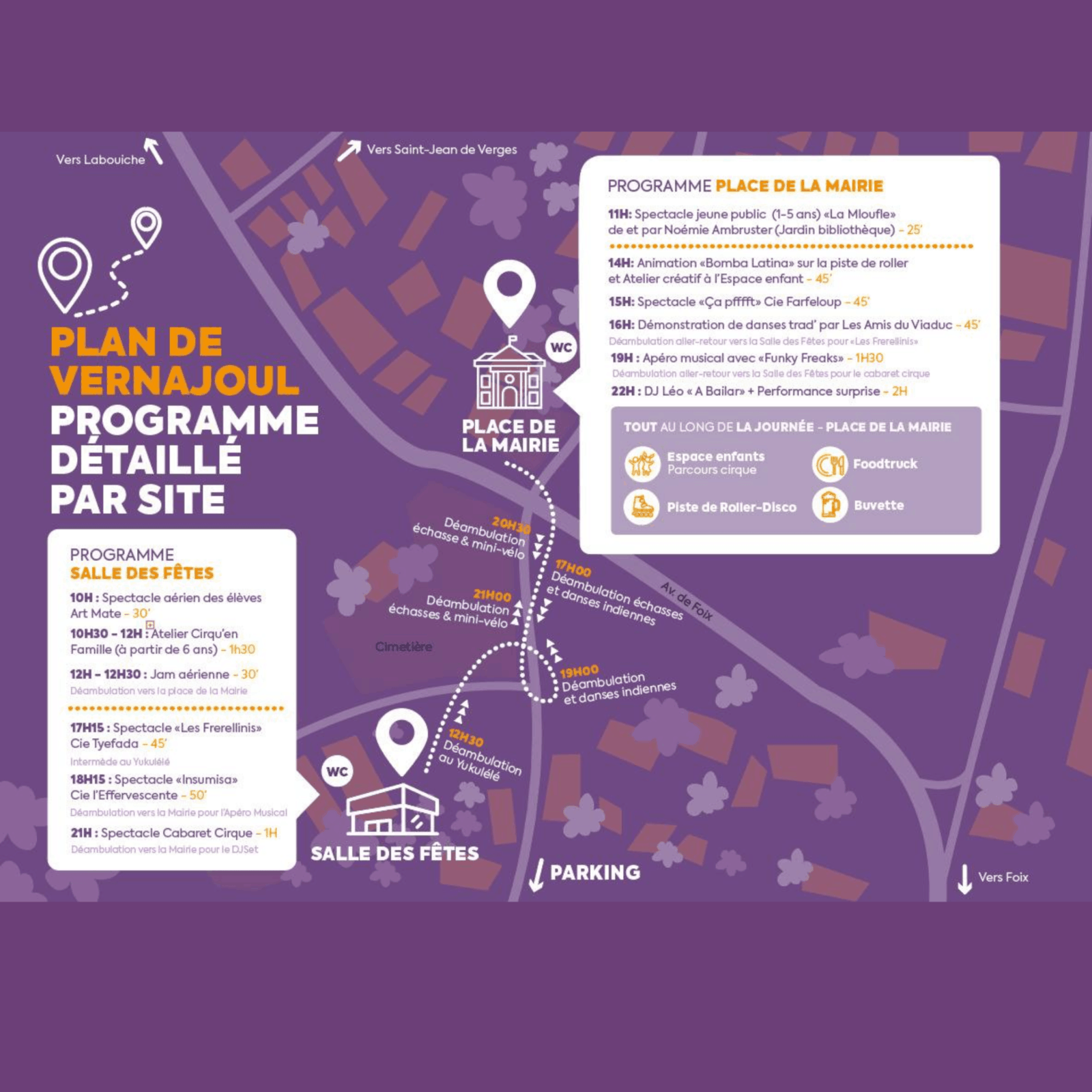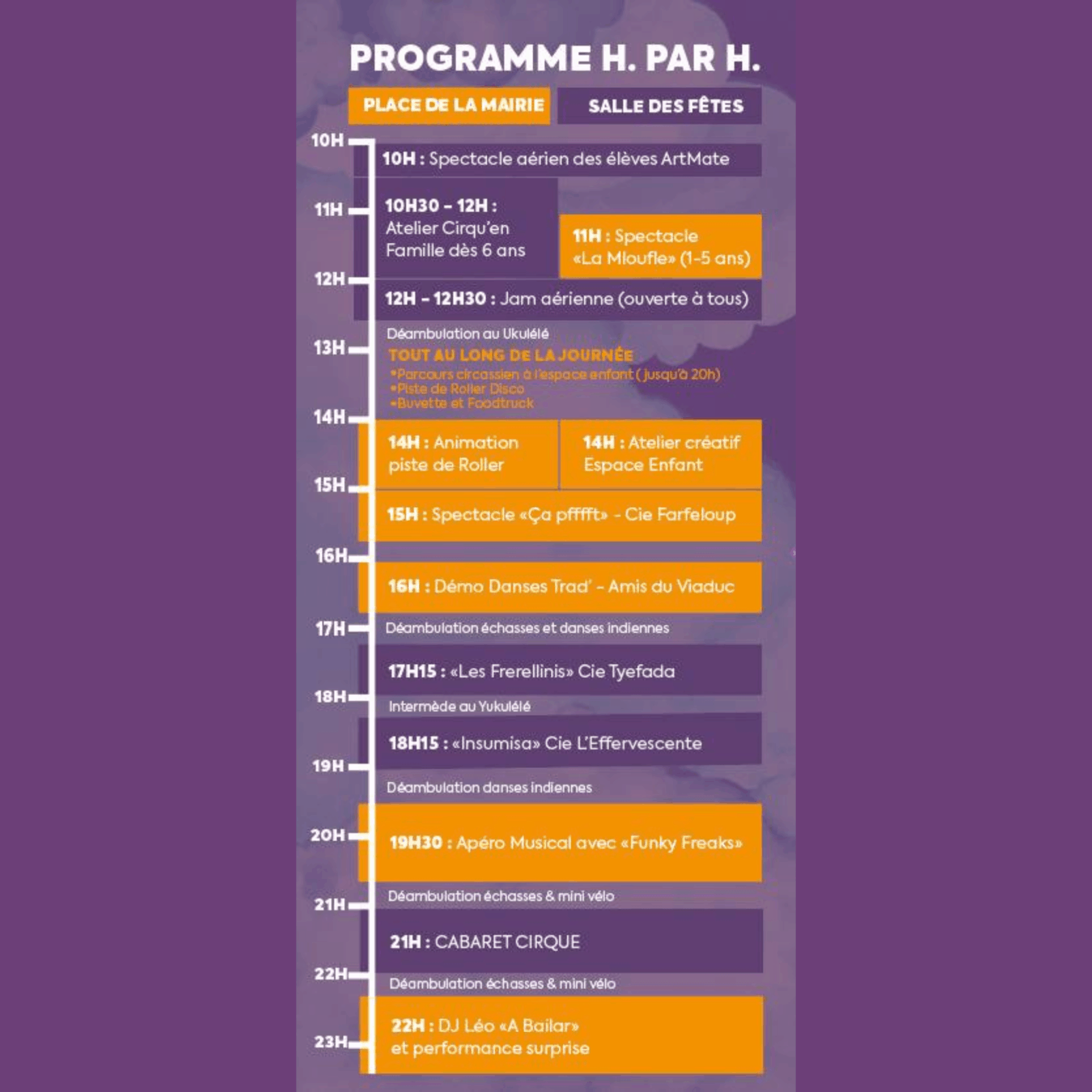 Spectacles de cirque et d'art de rue, concerts, cabaret, atelier cirque, animations, roller disco, maquillage, coin lecture, buvette et restauration...